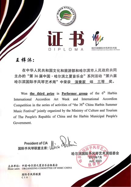 在最高级别组演奏家组比赛中,2023届硕士毕业生张之远(指导教师:孟辉教授)获得第一名;2020级本科生王梓沐(指导教师:刘文林教授)获得三等奖。