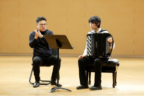 刘睿博士毕业于俄罗斯国立格涅辛音乐学院,拥有13年留俄深造经历。大师课上,4名学生分别演奏了斯卡拉蒂《G大调奏鸣曲》、弗拉索夫《春天》、谢苗诺夫《随想曲一号》、柴可夫斯基《六月船歌》《四月松雪草》、韦伯《音乐会协奏曲终曲》等巴扬手风琴原创与改编作品。刘睿围绕巴扬演奏的触键技巧、风箱控制、乐句呼吸及作品情感表达等核心要点,展开精准细致的示范性讲解与针对性指导,他通过生动示范、通俗解析,让在场师生深刻领悟到手风琴演奏不仅是技艺的展现,更在于真挚地抒发与传递演奏者内心的音乐情愫,唯有站在听众视角,以细腻的声音控制与精巧的音乐处理,方能实现与观众的深度沟通和情感共鸣。