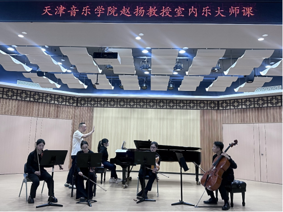 赵扬教授通过理论解析、演奏示范与互动指导,深入阐释民族乐派韵律特征、古典作品结构逻辑及交响化思维在室内乐中的体现,并分享了合作钢琴领域的教学理念与实践方法,强调技术训练与音乐表达的有机统一。课后,赵扬教授还与管弦系教师就学科建设与人才培养进行了深入交流。