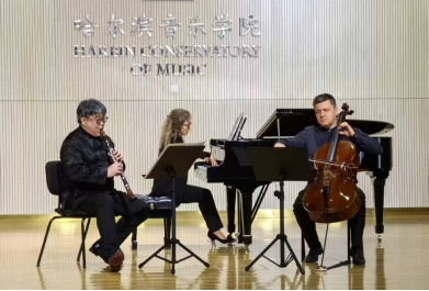 在艺术节交流音乐会上,解川教授带来了两场精彩的合作演出。首先,他与俄罗斯钢琴家维罗妮卡、大提琴家弗拉基米尔携手,共同演绎了《贝多芬三重奏作品11号》第二乐章。三位艺术家凭借精湛的技艺与默契的配合,将贝多芬作品中兼具抒情性与戏剧性的特点展现得淋漓尽致。随后,解川教授又与哈尔滨音乐学院青年教师王宇、江幸泽合作,演奏了朱塞佩·里柯达的《单簧管双胞胎》,该作品以灵动的节奏、俏皮的旋律著称,三人通过精准的节奏把控与生动的音乐表达,完美诠释了作品的独特风格。