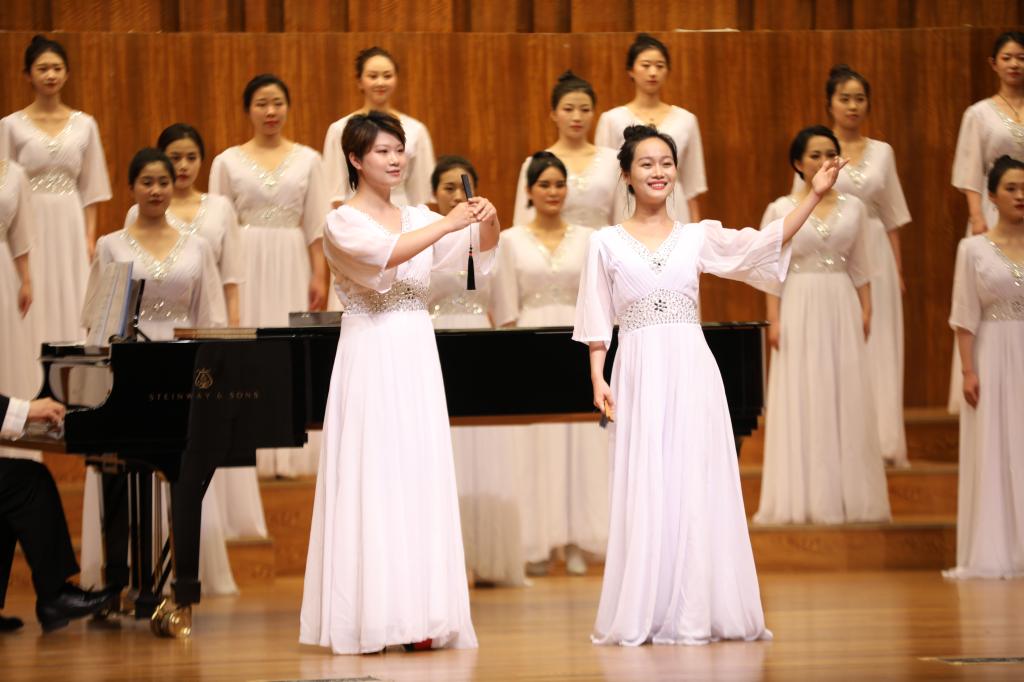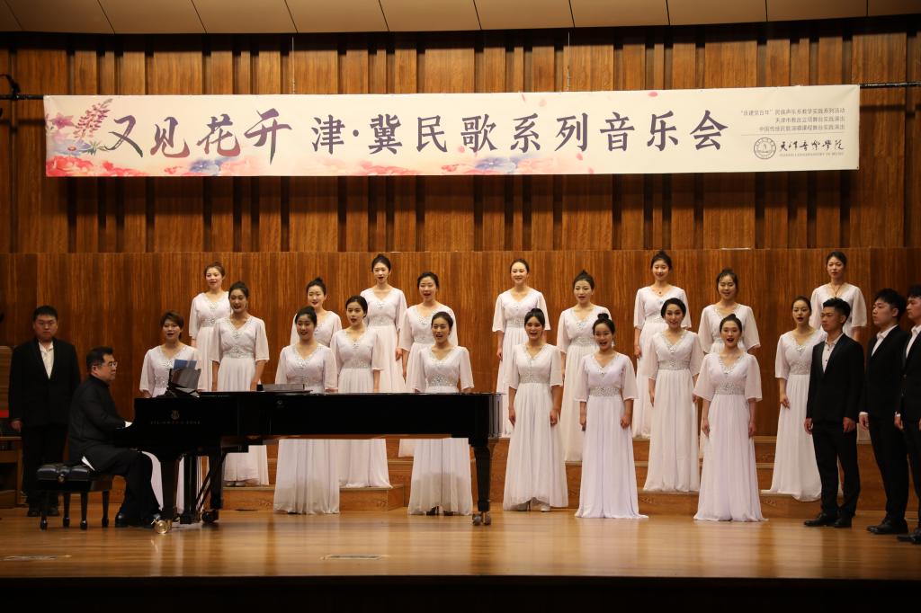 音乐会以女生合唱河北民歌《闹元宵》开场。由梁美惠、叶骏逸同学分别演唱了河北民歌《放风筝》和《虹彩妹妹》。女高音重唱天津民歌《画扇面》将我们带回了那个街头巷尾人人哼唱的老天津卫。之后由杨昊龙、刘迎宵、苗宸瑞、项君君同学演唱了河北民歌《小白菜》、天津民歌《妈妈娘你好糊涂》、张北民歌《走西口》,同学们各具特色的声腔与语调,把民歌中饱含的感情表现得淋漓尽致。同学们以男生合唱和女生合唱的形式,分别演绎了河北民歌《小放牛》、张家口民歌《散花》、晋县民歌《反对花》、冀东民歌《捡棉花》和《小看戏》。同学们清澈明亮的歌声,为我们展现了河北各地域民歌独具特色的方言、唱腔和语调,让观众们清晰地感受到了津冀民歌的风格特点。音乐会的最后,全体学生演唱了天津民歌《莲花落》和河北民歌《十朵花》。