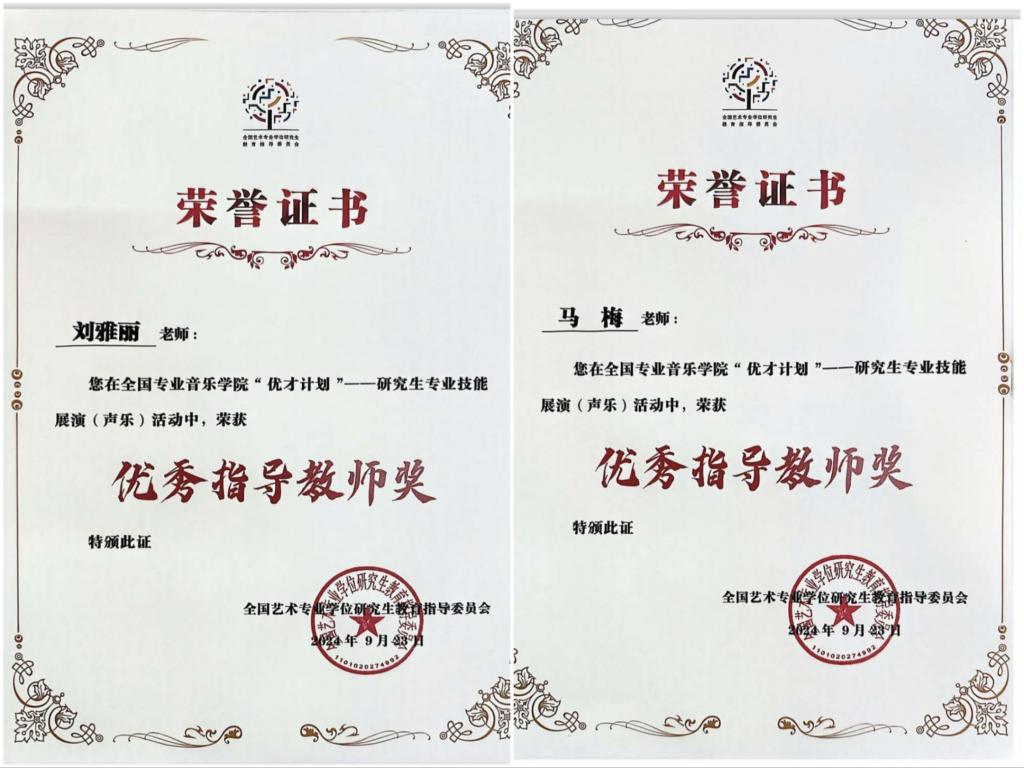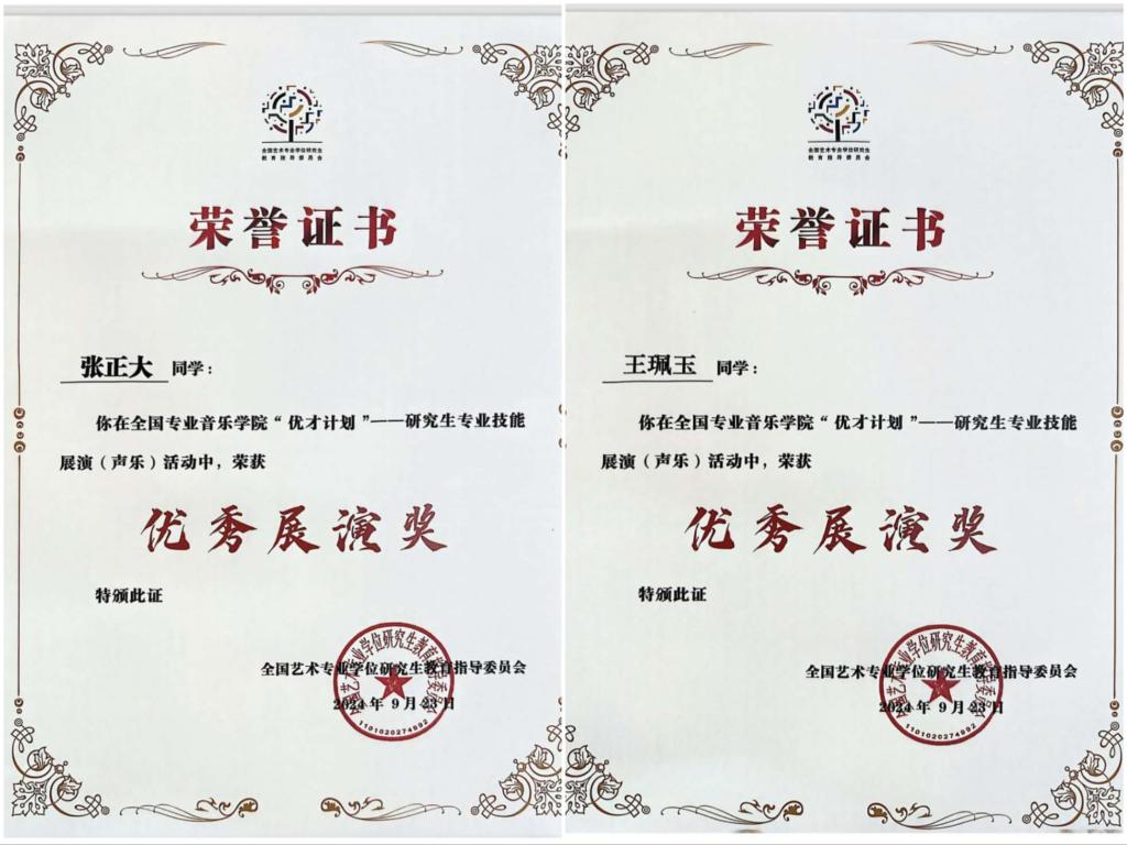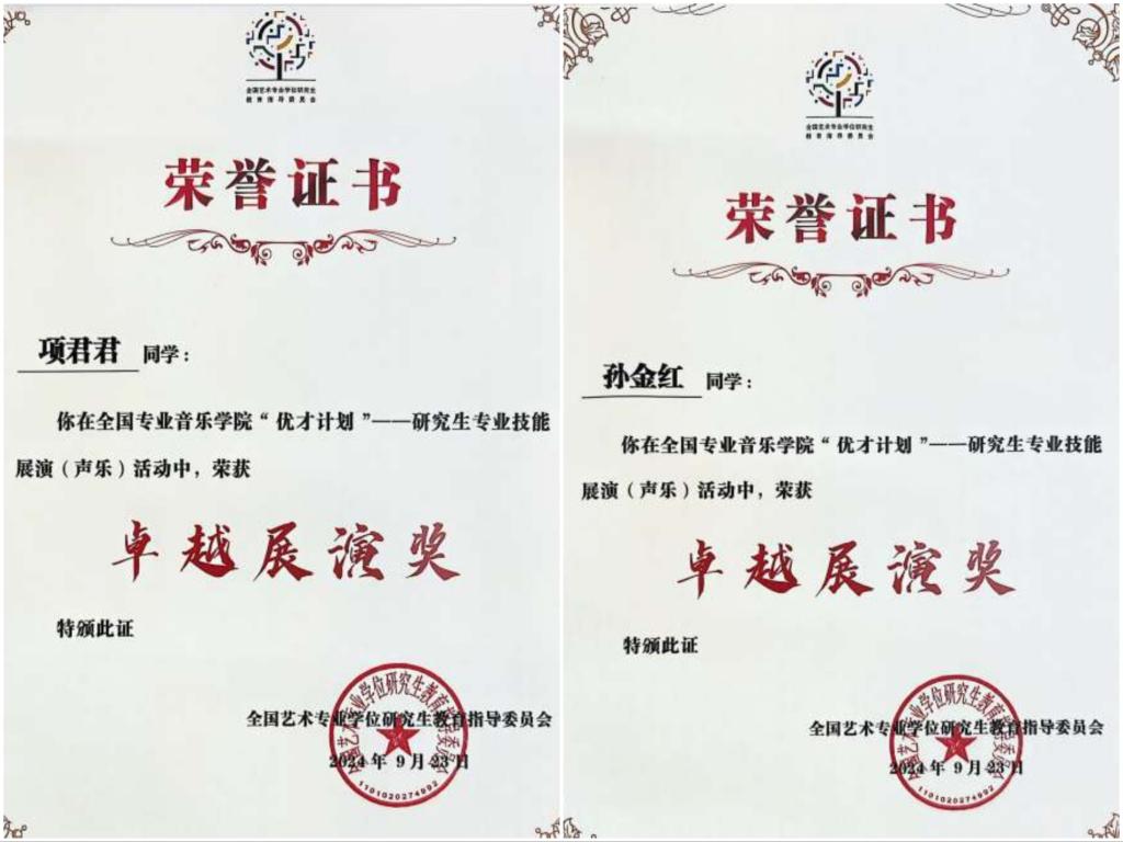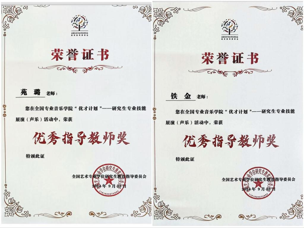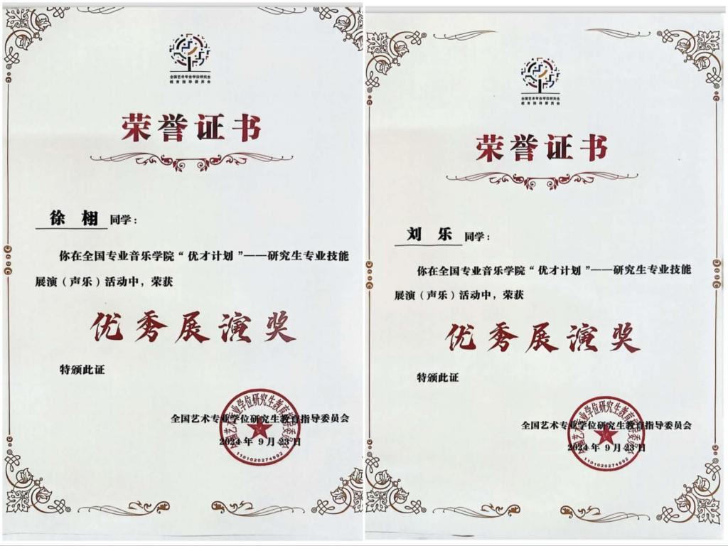 9月23日至24日,首届全国专业音乐学院“优才计划”——研究生专业技能展演(声乐)暨全国专业音乐学院研究生教育论坛在哈尔滨音乐学院成功举办。歌剧学院研究生孙金红、项君君荣获卓越展演奖,王珮玉、徐栩、刘乐、张正大荣获优秀展演奖,马梅、刘雅丽、铁金、苑璐荣获优秀指导教师奖。